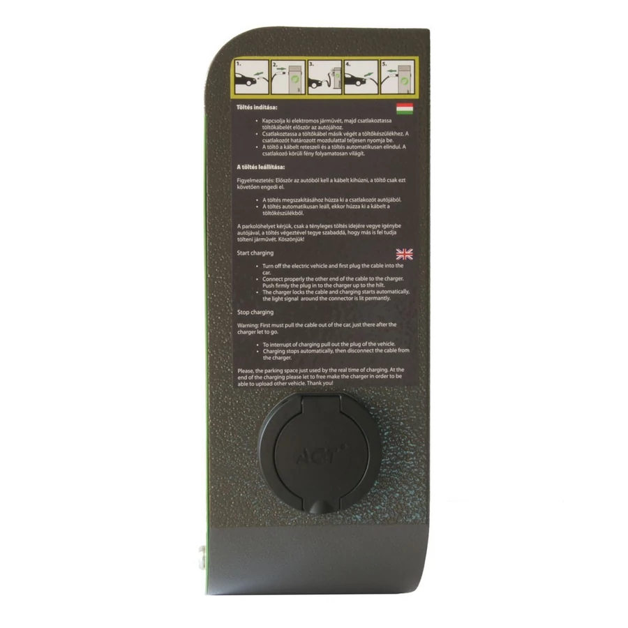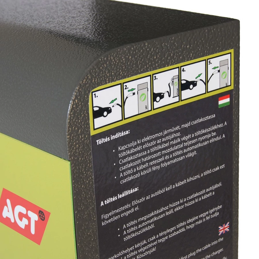 AGT Compact I. Easy 11 vagy 22 kW teljesítményű elektromos autó töltőállomás minden elektromos autóval kompatibilis európai szabványnak megfelelő Type2 típusú csatlakozó aljzattal rendelkezik. Az autó csatlakoztatása után a szabványos kommunikációt követően a töltés automatikusan elindul, teljes feltöltődést követően kikapcsol, illetve bármikor megszakítható a töltőkábel autóból való kihúzásával. Opcionálisan tartóoszlop, kapcsolási lehetőség, intelligens árammegosztó, fogyasztásmérő, kijelző, egyedi szín és felirat kérhető, hálózatba integrálható.