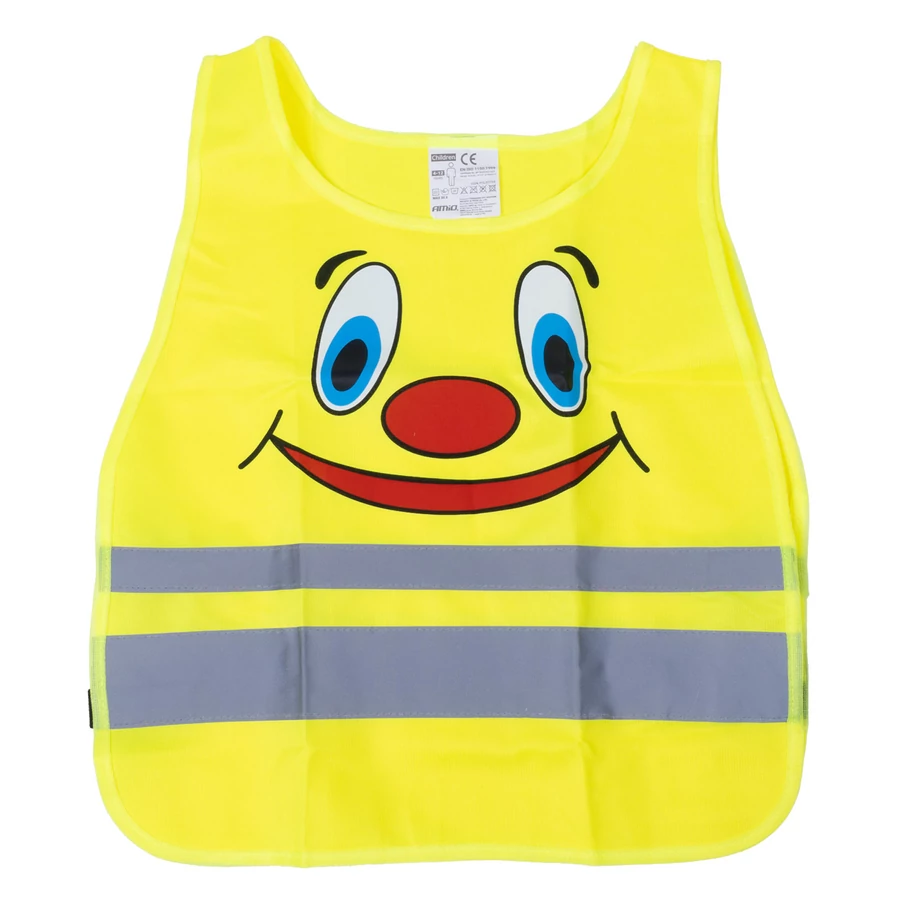 Karikatúrával és fényvisszaverővel ellátott mellény gyermekek számára, az élénksárga szín jól láthatóvá teszi a gyermeket az úton, ha autóhiba történik utazás közben stb. A mellényt mindig érdemes a hátizsákban vagy az autóban magunknál tartani - szükség esetén mindig kéznél lesz. A tárolás egyszerű, a mellény összehajtva nagyon kis helyet foglal! A mellény viselése, különösen sötétedés után, jelentősen növeli a közlekedésbiztonságot. Este a fényvisszaverő elemek nélküli gyalogos a tompított fényben csak kb. 20-30 m távolságból látható. Fényvisszaverő mellénnyel viszont a gyalogos 130-150 m távolságból látható, ami ötször több időt ad a járművezetőnek a reagálásra. Az ezüstszínű szövetből készült két fényvisszaverő csík világít a fény hatására. Az EN 1150:1999 szabvány szerint tanúsított.