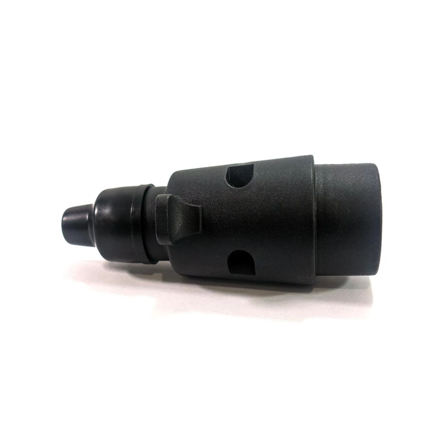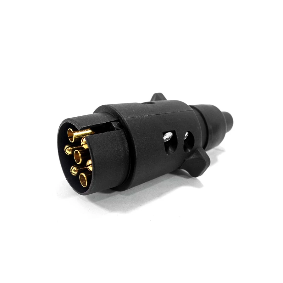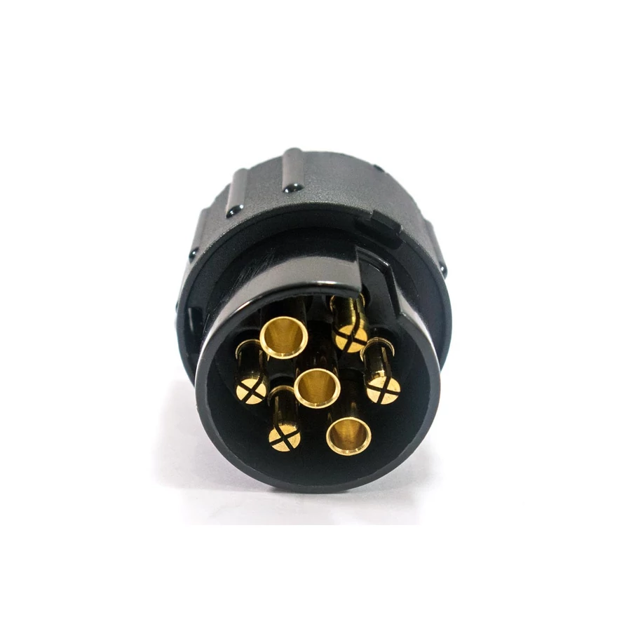 Műanyag csatlakozó dugó 7 pólusú pótkocsikhoz és lakókocsikhoz. A csatlakozó dugó rézérintkezőkkel rendelkezik. 12/24V-os rendszerhez használható.