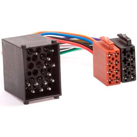 BMW autórádió csatlakozó ISO átalakító, BMW 17 Pin. Az átalakító csatlakozó kábelköteg tartalmazza a táp és a hangszóró kábeleket is, minden kábel feliratozva van a funkciójának megfelelően. A gyári kábelkötegen már semmi módosítás nem szükséges, a csatlakozó mindent átalakít az ISO szabványnak megfelelően