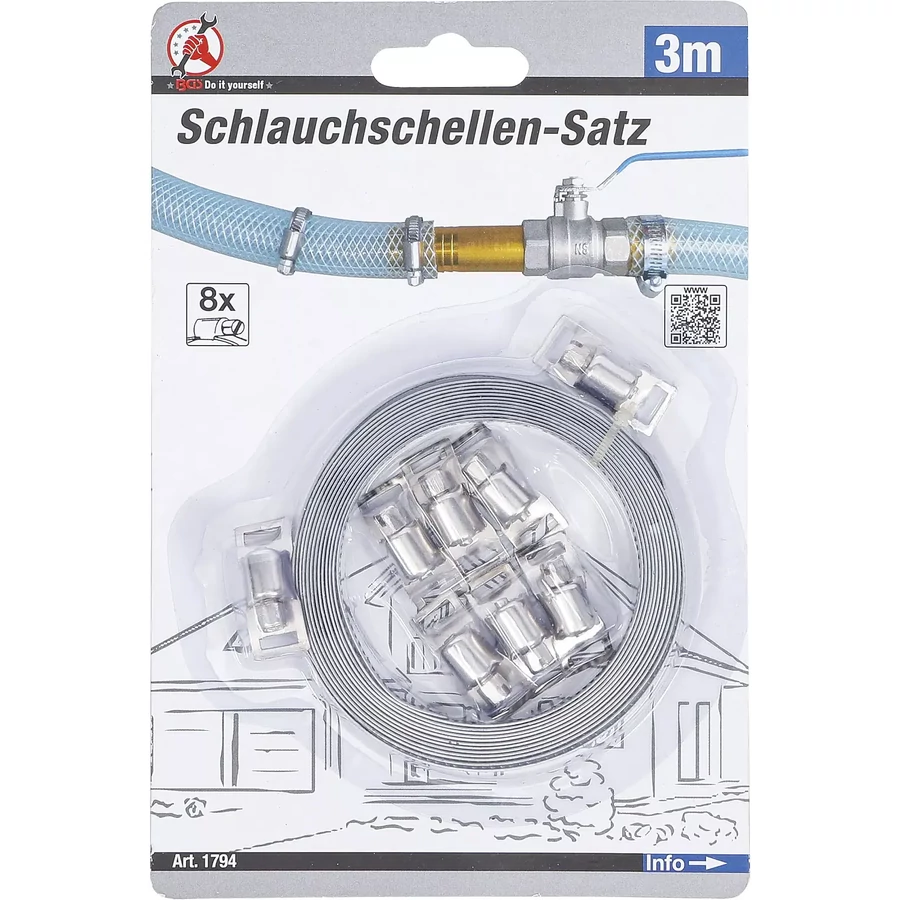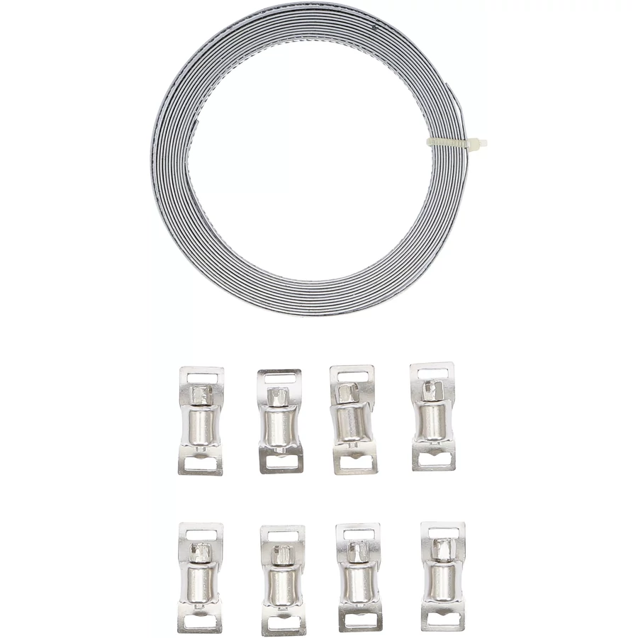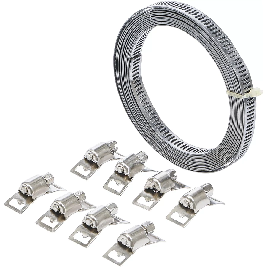 Ez a csőbilincs készlet egy 3 méteres szalaggal rendelkezik, amely kiváló választás, ha rugalmas megoldásra van szükség tömlők vagy kábelek rögzítésére.