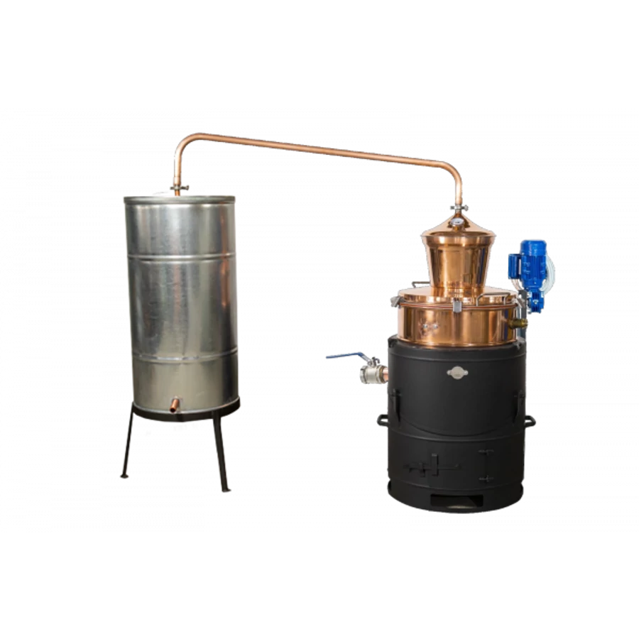 Ez a DES 100 literes pálinkafőző elektromos keverőmotorral felszerelve egyaránt alkalmas hobbi- és kisüzemi felhasználásra. A bilincses zárórendszer gyors és biztonságos nyitást/zárást tesz lehetővé, a leeresztőcsap pedig megkönnyíti a főzés utáni ürítést. A hűtést egy 200 literes, horganyzott spirálcsöves hűtő biztosítja, amely hatékonyan kondenzálja a gőzt a minőségi párlat érdekében.