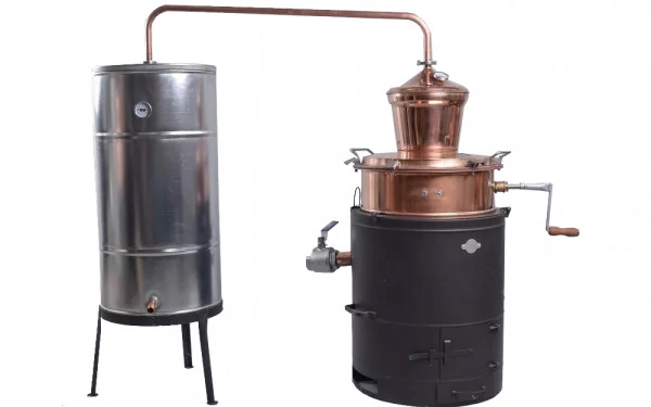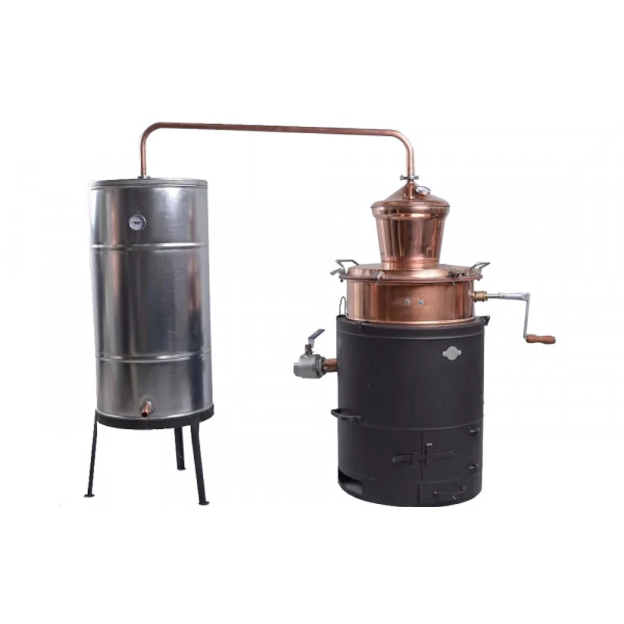 A DES 100 literes pálinkafőző kézi keverővel felszerelve, bilincses zárórendszerrel és leeresztőcsappal készült, amely megkönnyíti a munkát és a tisztítást. A főző minden, cefrével és párlattal érintkező része minősített elektrolit rézből készült, amely kiváló hővezető, ellenáll a szerves savaknak, és bizonyítottan javítja a párlat ízét és illatát. A kupola és az üst 4 mm vastag rozsdamentes acél peremmel és 10 mm vastag tömítéssel kapcsolódik egymáshoz.