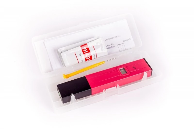 A digitális pH mérő mérési tartománya 0,0- 14,0 pH. Kalibrálása manuális, egypontos. Könnyű használat jellemzi. Az elektródot merítse 7 pH- puffer oldatba (M10007) a maximális merítési szintig, majd várjon, hogy a mérés stabilizálódjon. Ez után a kis csavarhúzó segítségével állítson a kalibráló csavaron, amíg a kijelzőn nem 7,0 pH látható.