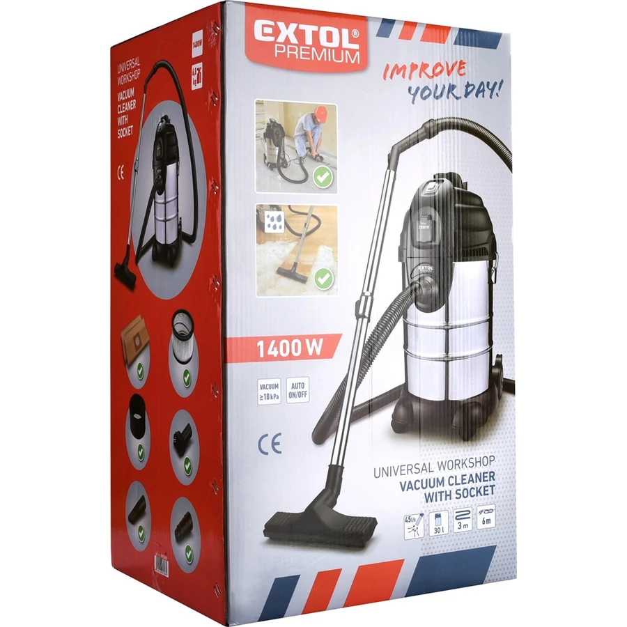 - 230 V-os beépített aljzat, elektromos kéziszerszámok csatlakoztatásához (a kéziszerszámot nem kell hosszabbítóhoz csatlakoztatni, a kéziszerszám kapcsolása működteti a porszívót is). HEPA szűrő félautomatikus tisztítása (a szűrő kiszerelése nélkül), a szívócső befogásával és a tisztító gomb megnyomásával.