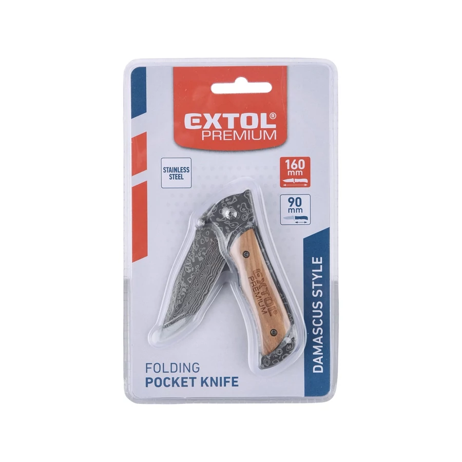 Rozsdamentes acél penge titánszürke színben, lézeres kontúrokkal damaszkuszi acél stílusban. Fogantyú világosbarna fával átlapolva. Biztosíték a kés spontán zárása ellen.
