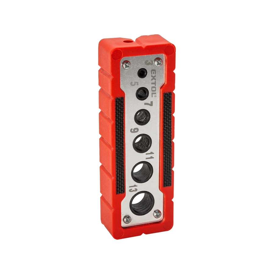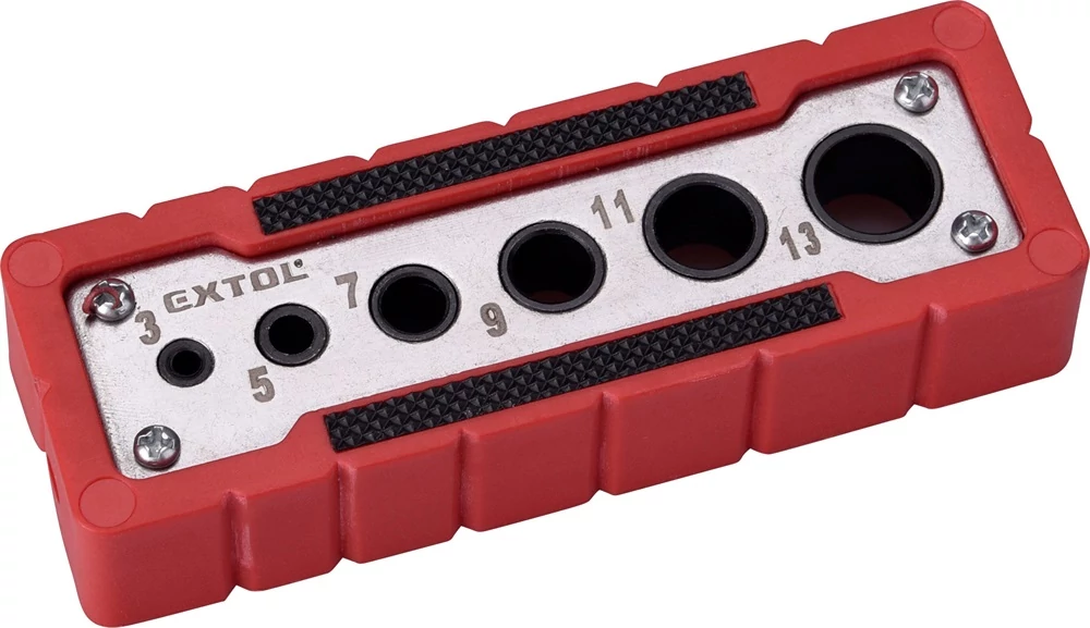 Extol Premium fúróvezető sablon, amelyen 6 db rozsdavezető hüvely található, ezeknek méretei 3 -5 -7 -9 -11 -13 mm.