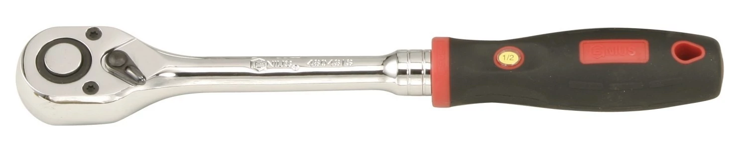 Gyors kioldógombos, biztonsági reteszelésű (quick-release) racsni ergonómikus, gumi borítású csúszásmentes markolattal.
