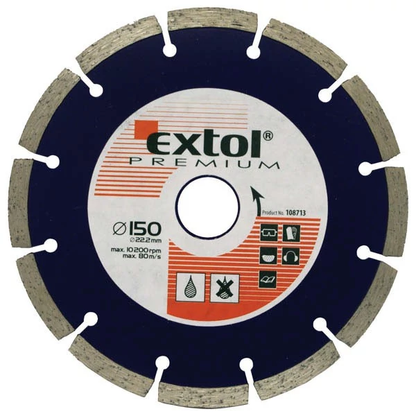 A gyémántvágó korongok nagy teljesítményű szerszámok melyek alkalmazásuk során nagy génybevételnek vannak kitéve. Az Extol Prémium gyémántvágó korongok megbízható, általános felhasználású vágószerszámok, melyek megfelelő biztonságot garantálnak Önnek a munkavégzés során  A  gyémántvágó korongot beton, tégla, cserép, téglafal, kő, gránit vágásra lehet használni. A megfelelő használatát a termék melletti tájékoztatóban olvashatja.