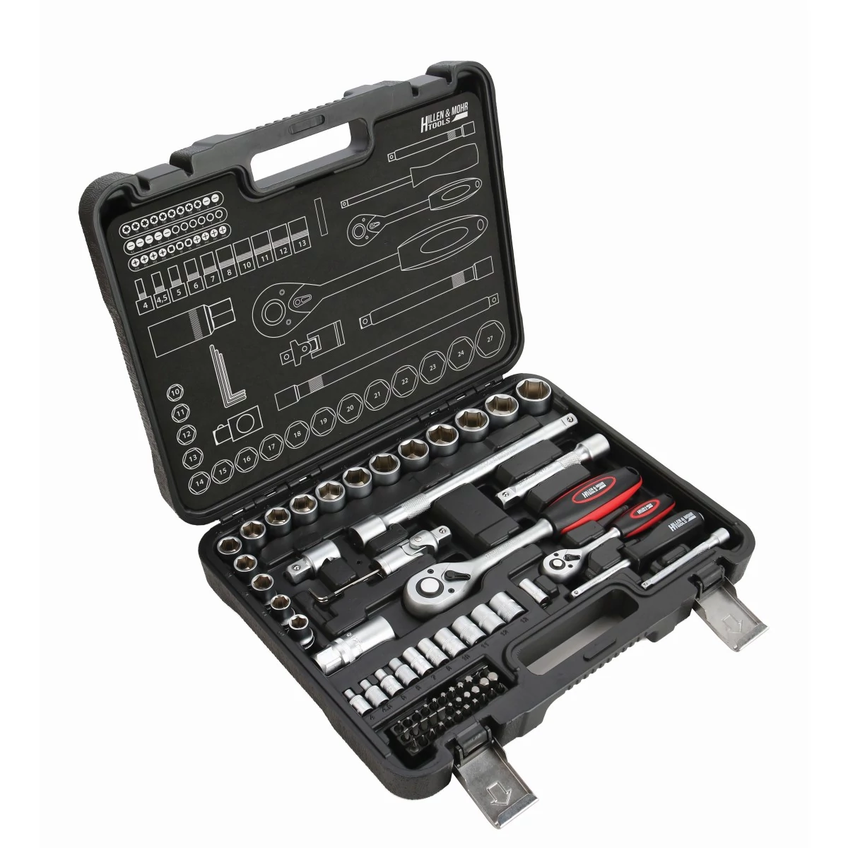- 1/2"-es dugókulcsok (16 db): 10 / 11 / 12 / 13 / 14 / 15 / 16 / 17 / 18 / 19 / 20 / 21 / 22 / 23 / 24 / 27 mm
