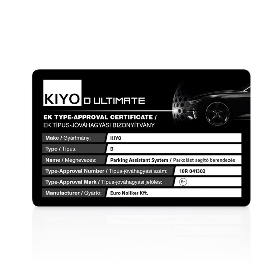 A magyar NKH (Nemzeti Közlekedési Hatóság) által jóváhagyott e7 minősítés (típusjóváhagyási bizonyítvány) alapján az eszköz, mint parkolósegéd, Európa bármely országában hivatalosan beszerelhető a gépjárműbe, és parkolósegédként használható. A csomagban mellékeljük a típusjóváhagyási plasztik kártyát, hogy szükség esetén bemutatható legyen.