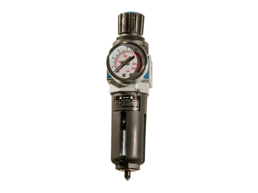 A pneumatikai vízelválasztó szűrő feladata, hogy a szilárd szennyeződéseket és a kondenzátumokat eltávolítsa a sűrített levegőből. A leeresztő szelepre csatlakoztatott műanyag cső segítségével elvezethető a kondenzátum. - nyomásszabályzó szelep