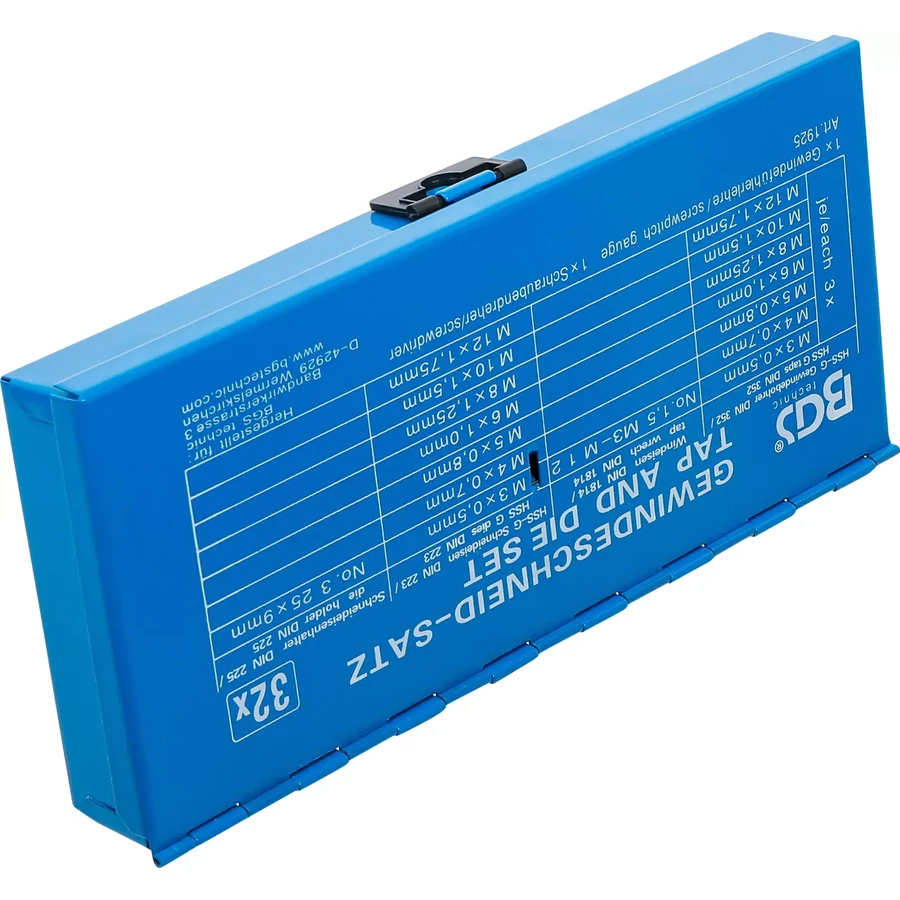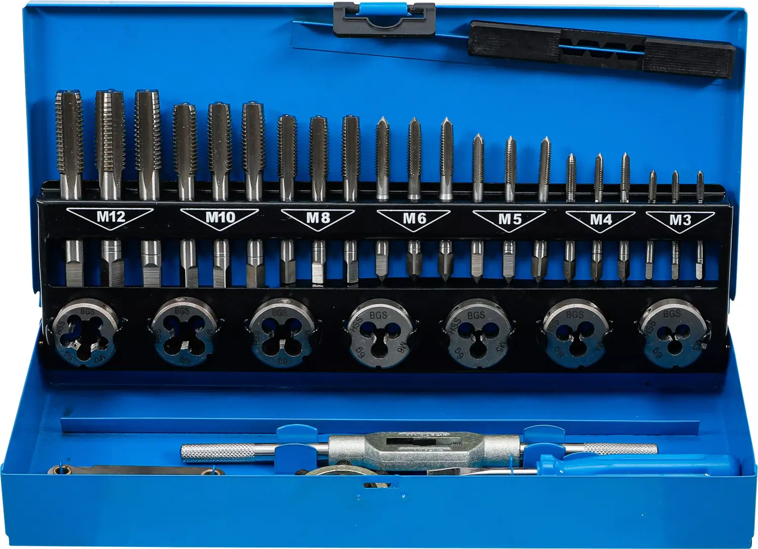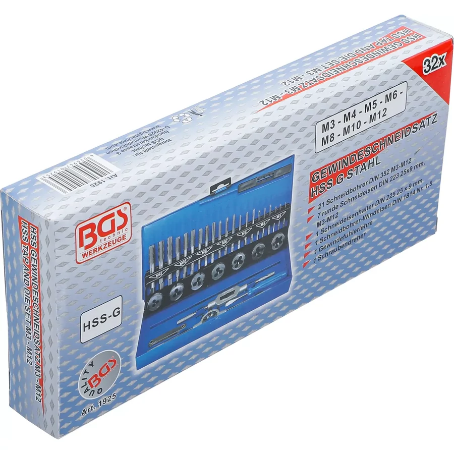 A BGS menetvágó készlet, amely M3 - M12 terjedő méreteket tartalmaz, összesen 32 darabot foglal magában. Ezek a készletek általában fúrókat és menetmetszőket tartalmaznak, amelyek alkalmasak különböző fémek megmunkálására.