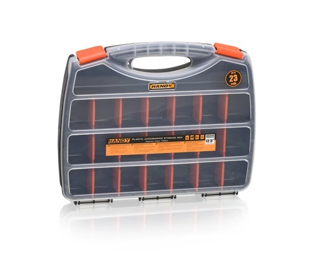 Praktikus műanyag doboz a kisebb tárgyak rendszerezett tároláshoz.
