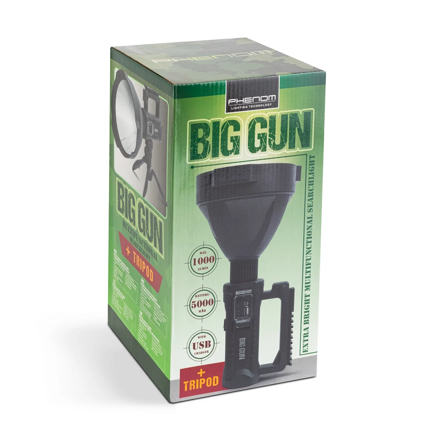 Strapabíró kialakítású, nagyméretű keresőreflektor, amely akkumulátoros működésének köszönhetően hosszan tartó működést garantál. A nagy teljesítményű, extra fényerővel rendelkező, XHP50-es CREE LED, akár 500 méter szúrófényt is képes kibocsátani magából, így minden körülmények között számíthat rá. A beépített USB porton keresztül - az 5000 mAh-s akkumulátorról - lehetőség nyílik tölteni eszközeinket (például: telefon, gps, rádió, elektromos öngyújtó). A robosztus kialakítású ház IP55 védelemmel rendelkezik, így esős, párás időben is kiváló szolgálatot nyújt. A lámpa kényelmes használatát kétféle csúszásmentes fogantyú garantálja, mely közül az egyik háromlábú tripoddá is alakítható, így bárhová elhelyezve állandó fényként világítja meg a munkaterületet. Ideális felszerelése lehet túrázóknak, vadászoknak, horgászoknak, keresőcsapatoknak, biztonsági őröknek vagy akár hatóság embereinek is.