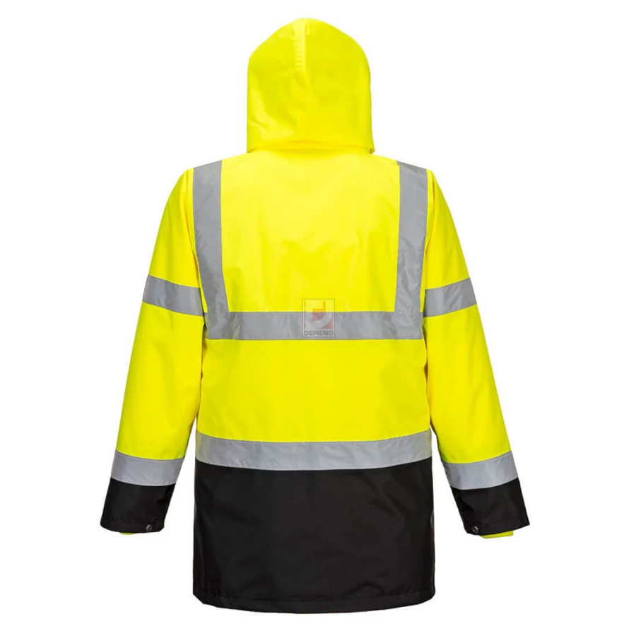 Kiváló ár-érték arányt képviselő 5 az 1-ben jól láthatósági munkavédelmi kabát (kontraszt színekkel). A külső kabáton praktikus tárolózsebek, patentos, állítható mandzsetta és rejtett kapucni található. A ragasztott varratok vízállóságot biztosítanak. A belső kabát levehető, fluoreszkáló polár ujjakkal, két tárolózsebbel és sötét színű kontraszt panelekkel rendelkezik. A kétutas cipzár a gyors és könnyű hozzáférést segíti. A kabát öt különböző funkcióban, akár egész évben viselhető. EN 20471 szabvány szerinti 50 mosásra minősítve.