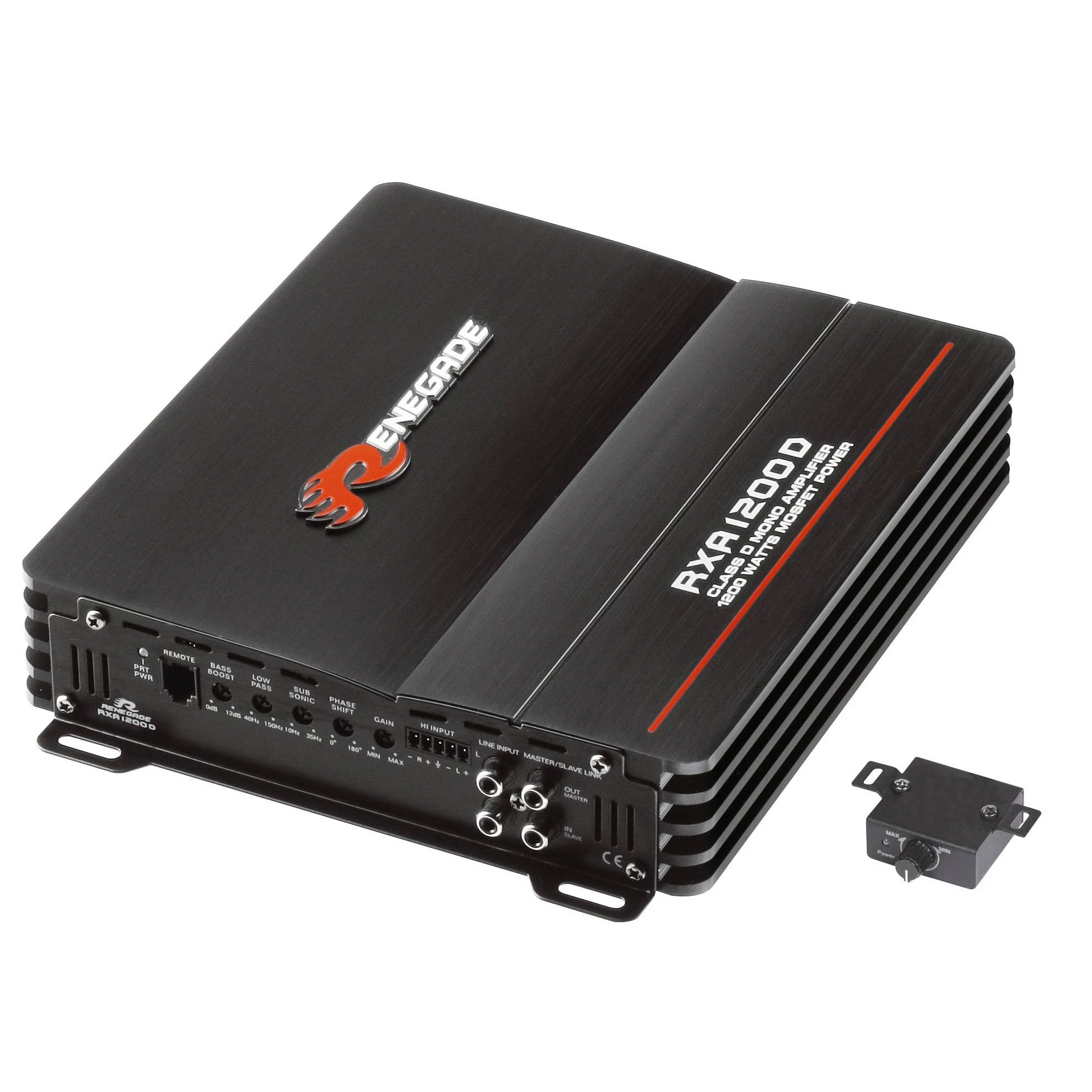 Renegade RXA1200D mono, 1 csatornás Class D digitális erősítő. Nagy teljesítmény, MOSFET táp, 4 Ohm / 2 Ohm / 1 Ohm stabil, 300 / 450 / 600 W RMS. Master / Slave sorolható funkció. Masszív alumínium hűtőbordák. Beépített állítható elektronikus hangváltó, Subsonic filter, Lowpass filter. Tartozék távvezérlő.