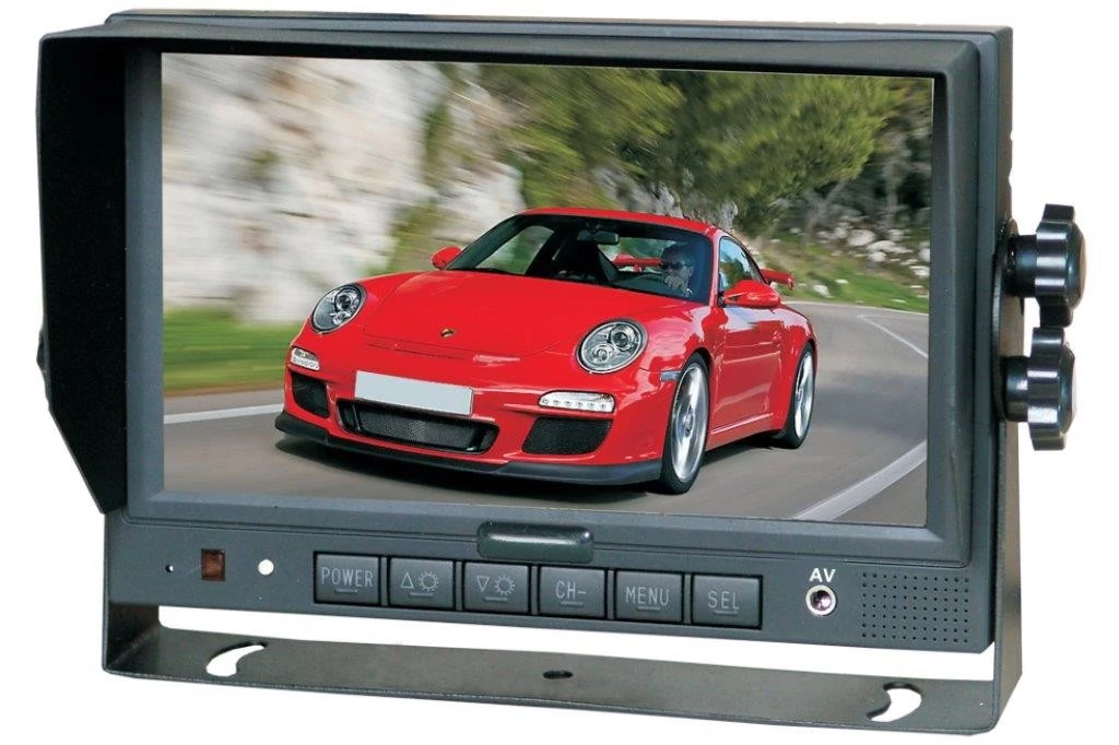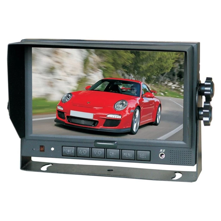 7" Digitális TFT monitor napellenzővel, 2 kamera bemenet, U alakú felfogató kengyel. Üzemi feszültség: DC 9-32V. Haszongépjárművekre fejlesztve, ipari felhasználásra.