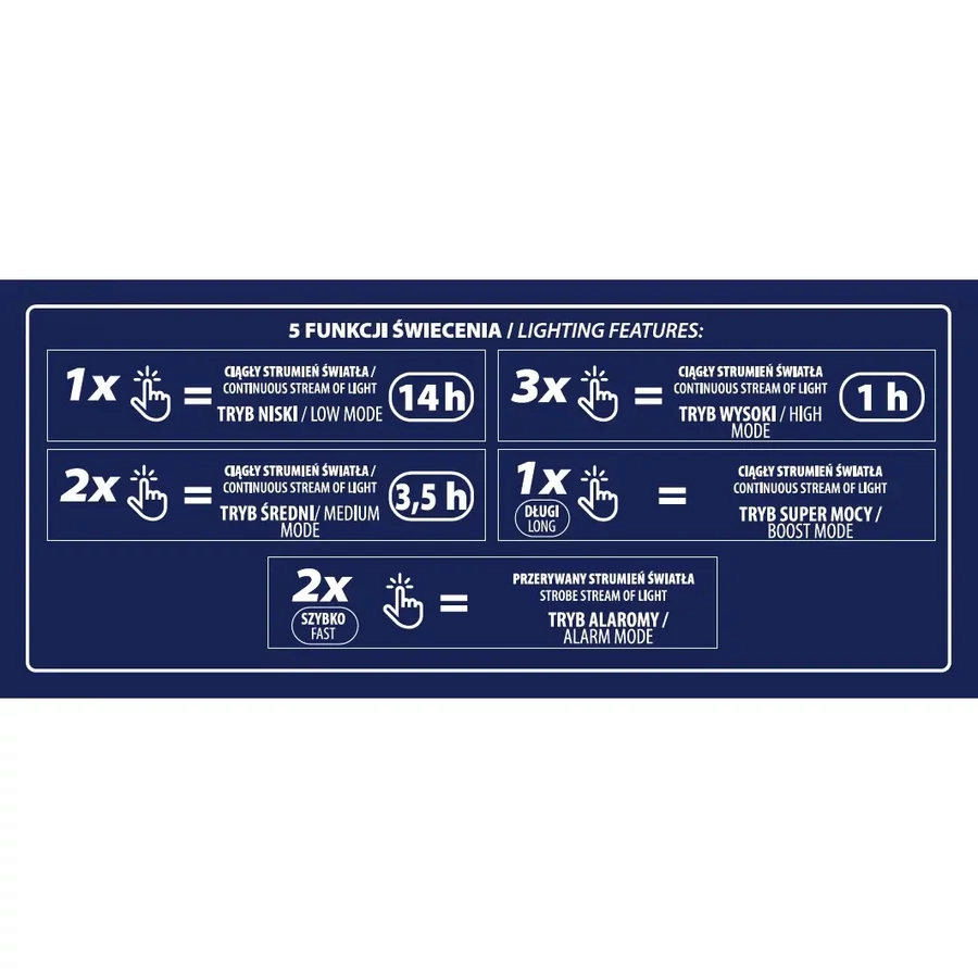 - Öt világítási mód – lehetőség a fényerő alkalmazkodtatására különböző igényekhez és körülményekhez