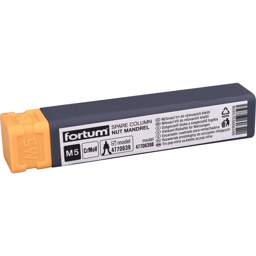 A Fortum szegecscsavar vezető és húzószár a 4770639 fogóhoz készült, és CrVMo (króm-vanádium-molibdén) anyagból készült, amely biztosítja a tartósságot és a megbízhatóságot.