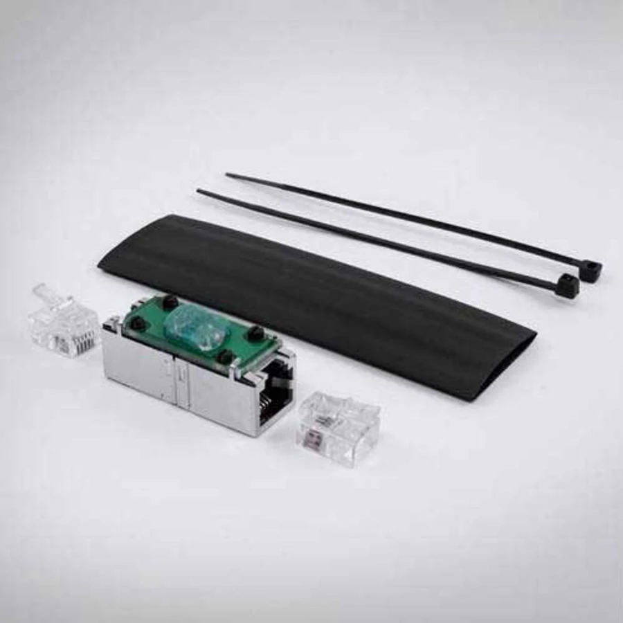 - A már levágott kábelek végére felkrimpleni a szetthez adott RJ12 6P6C csatlakozókat, valamint a tömítőanyagot elosztani a két kábel között.