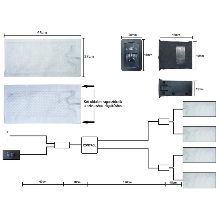 Tartozékok | 4 db fűtő párna Kábel köteg Kapcsoló Rögzítő ragasztó szalag Kábel kötöző |