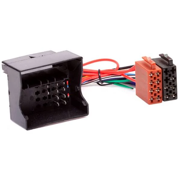 Volkswagen autórádió csatlakozó ISO átalakító, Volkswagen Quadlock csatlakozó. Az átalakító csatlakozó kábelköteg tartalmazza a táp és a hangszóró kábeleket is, minden kábel feliratozva van a funkciójának megfelelően. A gyári kábelkötegen már semmi módosítás nem szükséges, a csatlakozó mindent átalakít az ISO szabványnak megfelelően.