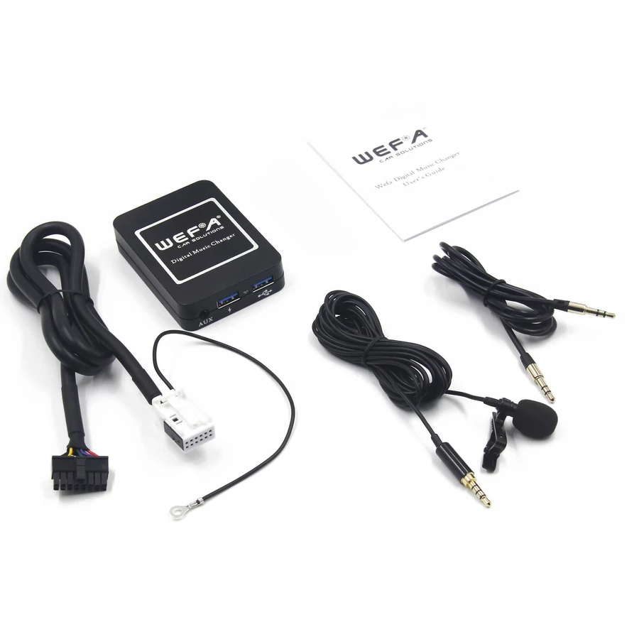 Wefa WF-606 (Volkswagen,Seat, Skoda, Audi Quadlock) Bluetooth kihangosító és USB, SD, Aux illesztő. A Wefa WF-606 Virtuális CD-tárként megjelenő, integrált, digitális médialejátszó és telefon kihangosító adapter, Bluetooth A2DP technológiával. Kéznélküli telefonkihangosítás és Bluetooth-on keresztüli sztereo zenelejátszás autójában.
