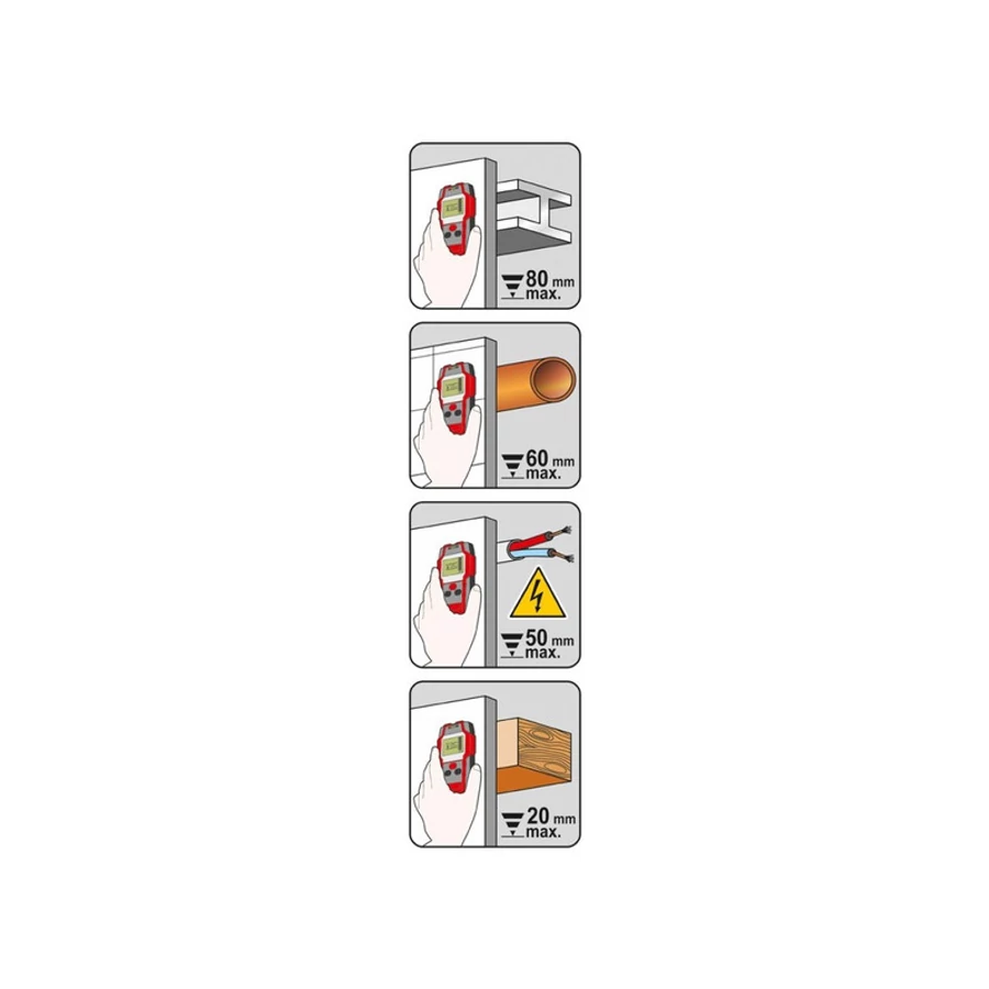 Ez a falszkenner (detektor-vezetékkereső) megtalálja a fal mögött húzódó gipszkarton sint, fa merevítőt, elektromos vezetéket, víz és gázvezetéket és digitálisan kijelzi, hogy milyen mélységben van.