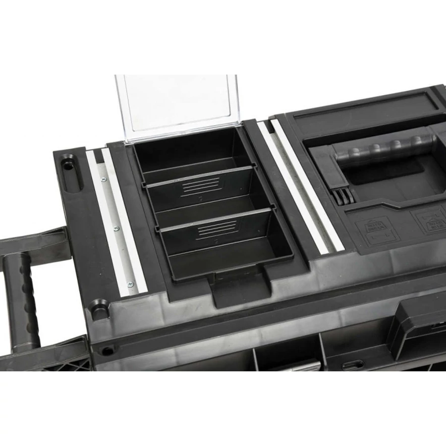 - 2 rendszerező a fedélben állítható, kivehető rekeszekkel és átlátszó polikarbonát fedéllel