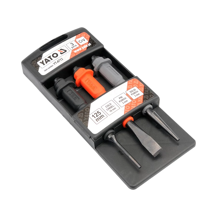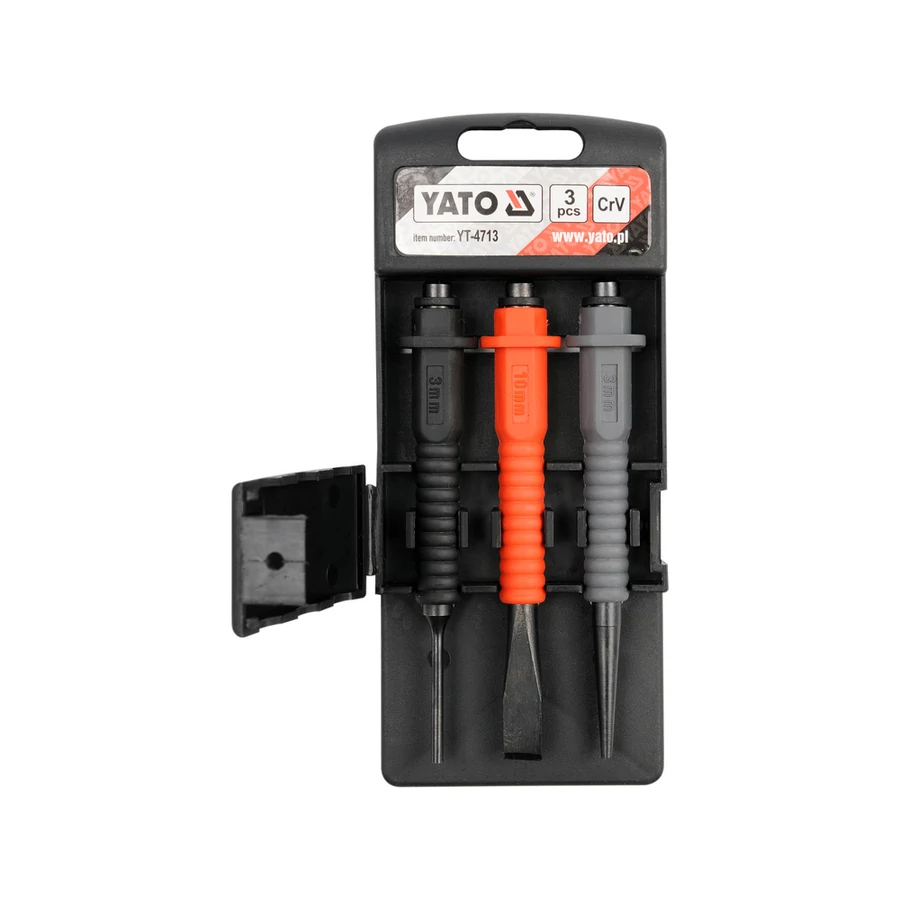 Ez a háromrészes Yato készlet precíziós fémmunkákhoz készült, és ideális véséshez, lyukasztáshoz és csapszegkiütéshez. A CrV acélból kovácsolt szerszámok tartósak, ergonomikus, védőkupakos markolattal ellátva.