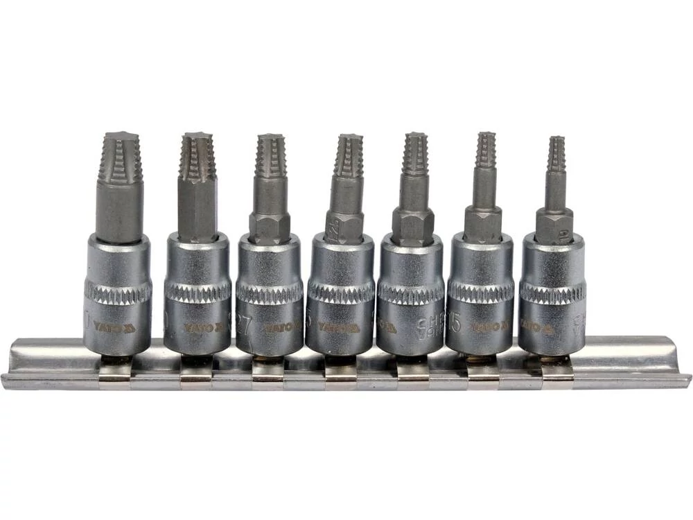 Spirális kialakítású bitkészlet a sérült torx csavarok kicsavarásához. A dugókulcs fejek egy sínre vannak helyezve.